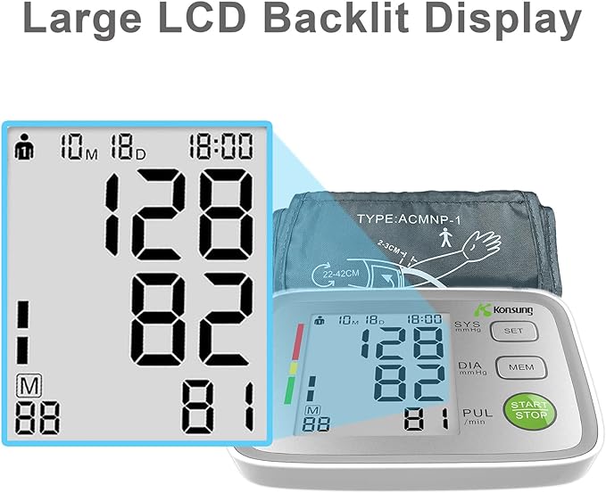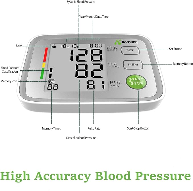 [Confiable y preciso para uso doméstico]: no es necesario salir, los monitores de presión arterial Konsung pueden ayudarlo a controlar su presión arterial y sus latidos cardíacos con precisión con mediciones precisas y de alta precisión en casa en cualquier momento. Nota: Para obtener la máxima precisión, puede mostrar automáticamente el promedio de sus últimas 3 lecturas.